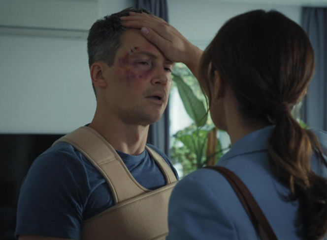 Mężczyzna z podbitym okiem, sińcami i opatrunkiem na skroni, w ortezie na klatce piersiowej, którego kobieta dotyka dłonią czoła. Ta scena z serialu "M jak miłość" jest dostępna na stronie Super Seriale.