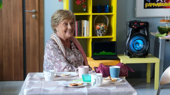 Barbara Mostowiak (Teresa Lipowska) uśmiechnięta siedzi przy stole z filiżankami i talerzami, w tle żółty regał z książkami i mały laptop. Jej mądra rada będzie kluczowa w 1910 odcinku "M jak miłość". Więcej informacji o serialu znajdziesz na stronie Super Seriale.
