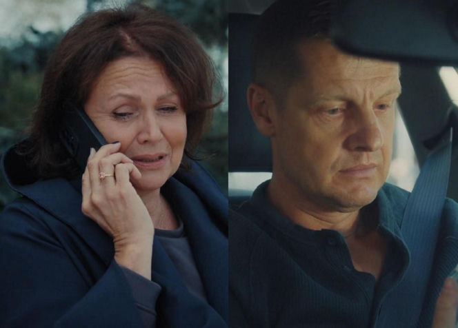 Małgorzata Pieńkowska jako Marysia Rogowska rozmawiająca przez telefon i Rafał Mroczek jako Paweł Zduński siedzący w samochodzie. Smutna Marysia, ubrana w granatowy płaszcz i szarą bluzkę, trzyma czarny telefon przy uchu. Ma na palcu pierścionek z różowym oczkiem. Paweł, również zasmucony, ma na sobie granatową koszulkę i zapięty pas bezpieczeństwa. Dowiedz się więcej o "Super Seriale".