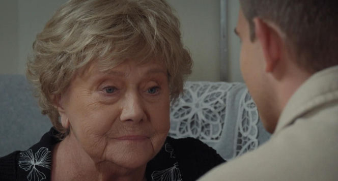 Barbara Mostowiak z serialu "M jak miłość" z krótkimi, blond włosami, ubrana w czarną bluzkę w białe kwiaty, patrzy smutnym wzrokiem na Mateusza, który jest widoczny z tyłu. Scena z pożegnania wnuka z babcią w żałobie, o czym przeczytasz na Super Seriale.