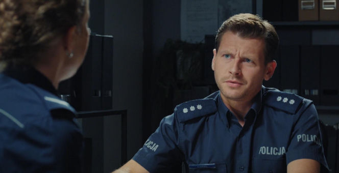 Komendant Adam Karski w niebieskim policyjnym mundurze patrzy na Natalkę. Scena z serialu "M jak miłość", gdzie Rafał donosi Natalce o romansie Adama, budząc jej zaniepokojenie. Więcej o ich relacji znajdziesz na Super Seriale.