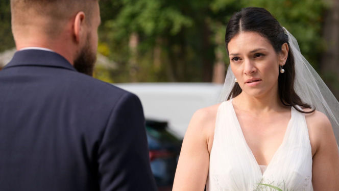 Panna młoda Ewelina (Anna Jarosik) w białej sukni ślubnej i welonie z perłowymi kolczykami, patrzy z zamyśleniem na Michała (Tomasz Rożniatowski) w garniturze. Zdjęcie przedstawia dramatyczny moment z odcinka 1911 serialu "M jak miłość", o którym więcej przeczytasz na Super Seriale.