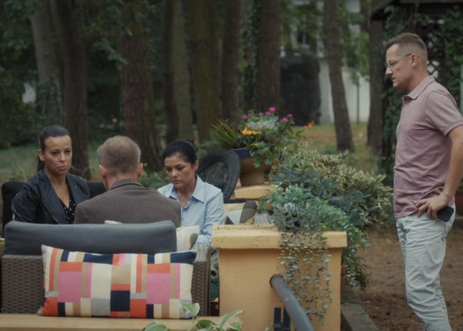 Piotrek Zduński z "M jak miłość" stojący na zewnątrz, podczas gdy Magda i Andrzej Budzyńscy siedzą w ogrodzie. Piotrek informuje o kontakcie z Pawłem po śmierci Franki, co można przeczytać na Super Seriale.
