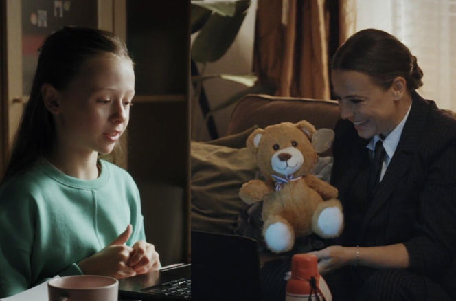 Nadia i Magda (Anna Mucha) rozmawiają online w serialu „M jak miłość”. Nadia siedzi przy laptopie, Magda uśmiecha się, trzymając misia. Scena symbolizuje utrzymanie kontaktu i troskę, ważny wątek w Super Seriale.