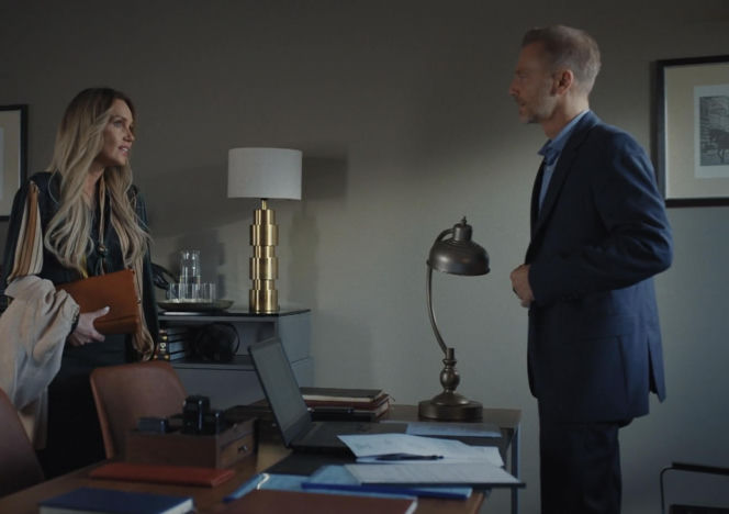 Anna Sadowska i Andrzej Budzyński w biurze. Blondwłosa Anna w pasiastej bluzce i ciemnej spódnicy trzyma brązową kopertówkę, patrząc na Andrzeja w granatowym garniturze. Budzyński stoi profilem, zwracając się do niej. To początek flirtu, o którym przeczytasz na Super Seriale.