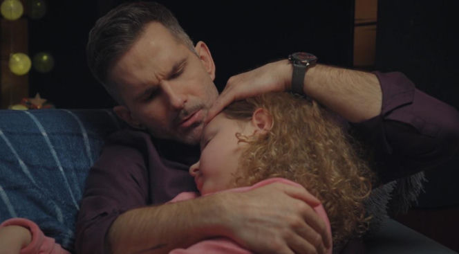 Kamil Gryc (Marcin Bosak) obejmujący swoją śpiącą córkę Polę (Hanna Nowosielska) na kanapie, podczas gdy Pola mierzy się z kryzysem i zmianą klasy, widok pełen troski i ojcowskiej miłości. Więcej informacji o serialu znajdziesz na Super Seriale.