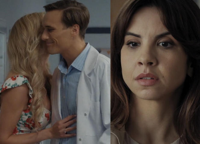 Kolaż: uśmiechnięty Olek Chodakowski (Maurycy Popiel) w lekarskim kitlu, z blondynką Morawską (Sylwia Bober) dotykającą jego piersi; obok zbliżenie na poważną twarz Anety (Ilona Janyst), zmartwionej sytuacją. Więcej o "M jak miłość" na Super Seriale.