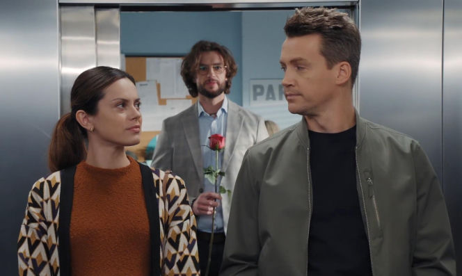 Paulina Lasota (Kasia) i Krzysztof Kwiatkowski (Jakub) patrzą na siebie w windzie, za nimi Mateusz Mosiewicz (Mariusz) z różą, sugerując napięcie emocjonalne przed oświadczynami. Więcej o losach bohaterów przeczytasz na portalu Super Seriale.