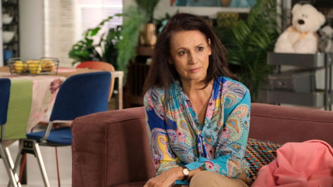 Kadr z serialu "M jak miłość" przedstawia Aleksandrę (Małgorzata Pieczyńska) siedzącą na kanapie w kolorowej, wzorzystej koszuli, z zamyśloną miną, co wskazuje na jej wątpliwości dotyczące związku z Erwinem. Więcej na ten temat przeczytasz na Super Seriale.