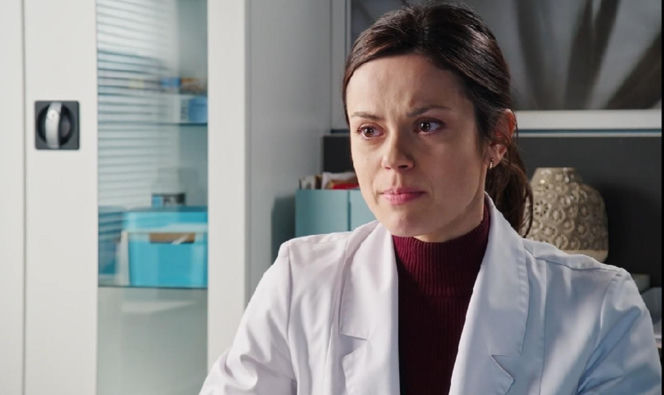 Kasia (Paulina Lasota) z serialu "M jak miłość" w lekarskim kitlu, z zamyśloną miną, co odzwierciedla jej dylemat związany z porzuceniem pracy w klinice na żądanie Mariusza. O tej i innych perypetiach bohaterów przeczytasz na Super Seriale.
