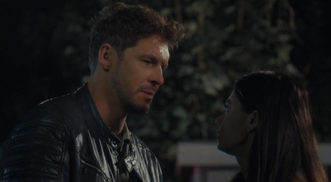 Mężczyzna i kobieta patrzą na siebie z troską w wieczornej scenerii. Marcin (Mikołaj Roznerski) w czarnej skórzanej kurtce, z krótkimi włosami, spogląda na Izę (Adriana Kalska), której długie, ciemne włosy delikatnie błyszczą. Ich spojrzenia sugerują ważne rozmowy i wspólne przeżycia, tak jak w odcinku "M jak miłość" opisywanym na stronie Super Seriale.
