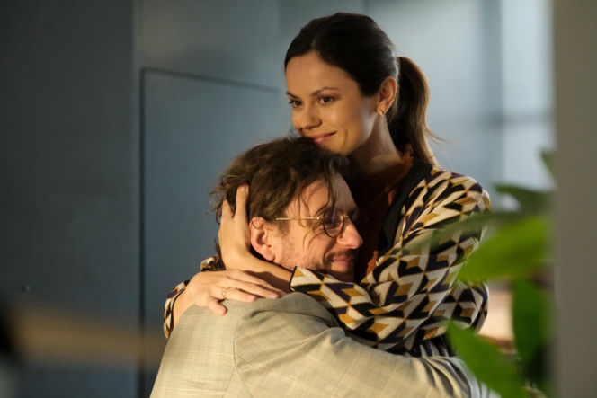 Kasia (Paulina Lasota) obejmująca Mariusza (Mateusz Mosiewicz) od tyłu, trzymająca dłonie na jego ramionach, oboje uśmiechnięci. Kasia ma na palcu pierścionek zaręczynowy, co odnosi się do wymuszonych zaręczyn z serialu "M jak miłość". Więcej szczegółów na temat tej sceny znajdziesz na stronie Super Seriale.