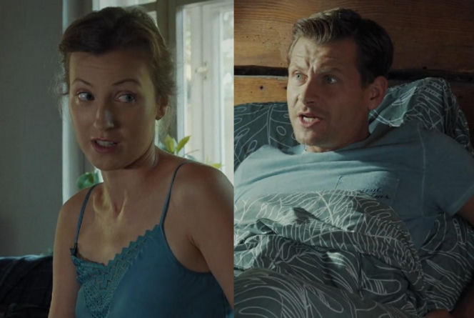 Aktorka Dominika Suchecka jako Natalka w niebieskiej bluzce na ramiączkach i aktor Patryk Szwichtenberg jako Adam Karski w niebieskim T-shircie, oboje z otwartymi ustami, patrzą na siebie z emocjami, co zapowiada koniec sielanki w "M jak miłość". Więcej o serialu przeczytasz na Super Seriale.