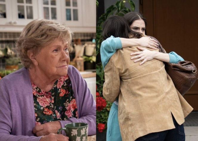 Kolaż zdjęć przedstawiający Barbarę Mostowiak (Teresa Lipowska) oraz dwie młode kobiety w uścisku. Mostowiakowa w fioletowym swetrze i kwiecistej bluzce pije herbatę. Po prawej, Basia (Karina Woźniak) obejmuje swoją przyrodnią siostrę Agnes (Amanda Mincewicz), co ilustruje artykuł o serialu "M jak miłość" na Super Seriale.