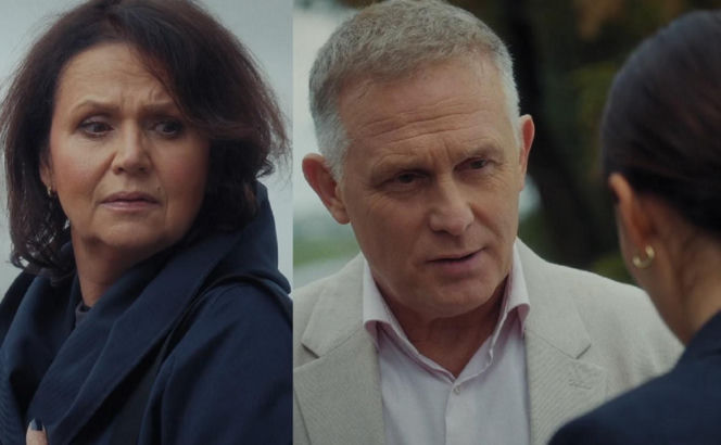Aktorka Małgorzata Pieńkowska jako Marysia Rogowska z zaniepokojoną miną oraz Robert Moskwa jako Artur Rogowski rozmawiający z kobietą w jasnej marynarce, nawiązując do kryzysu w serialu "M jak miłość". Więcej o losach bohaterów na Super Seriale.