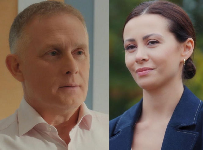Zestawienie Artura Rogowskiego i Joanny Dobrzańskiej z "M jak miłość". Lekarz w białej koszuli i młoda kobieta w granatowej marynarce, która próbuje uwieść męża Marysi. Więcej o ich relacji przeczytasz na Super Seriale.