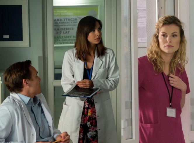 Trzy osoby, Olek (Maurycy Popiel) siedzi z ołówkiem w ręku, obok stoi stażystka Klaudia (Magdalena Dwurzyńska) w białym kitlu, trzymająca teczkę. Zza drzwi, w różowym uniformie lekarskim, spogląda z dezaprobatą Aneta (Ilona Janyst). Scena z serialu "M jak miłość" dostępna na Super Seriale.