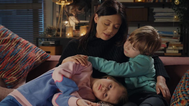 Iza Chodakowska (Adriana Kalska) z dziećmi, Majką (Laura Jankowska) i Szymkiem (Staś Szczypiński), siedzą razem na kanapie w domu. Iza spogląda w dół, trzymając rękę na Szymku, który opiera głowę na jej ramieniu. Majka leży na poduszce, patrząc prosto na widza. Więcej o dramatycznych losach Izy na Śląsku na Super Seriale.