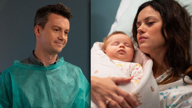 Aktor Krzysztof Kwiatkowski jako Jakub w zielonym fartuchu medycznym oraz Paulina Lasota jako Kasia trzymająca noworodka, co zapowiada dramatyczne wydarzenia w serialu "M jak miłość". Czytaj o tym na Super Seriale.