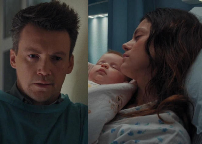 Aktor Krzysztof Kwiatkowski jako Jakub w zielonym stroju medycznym z łzą w oku i aktorka Paulina Lasota jako Kasia z noworodkiem na rękach w szpitalu. Emocjonalny moment z serialu "M jak miłość". Więcej o tym na Super Seriale.