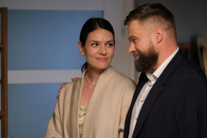 Ewelina (Anna Jarosik) i Michał (Tomasz Rożniatowski) z "M jak miłość" stoją blisko siebie, patrząc na siebie z uśmiechem. Kobieta ma na szyi perłowy naszyjnik, a mężczyzna ciemną marynarkę. Więcej o ich losach w "M jak miłość" na portalu Super Seriale.