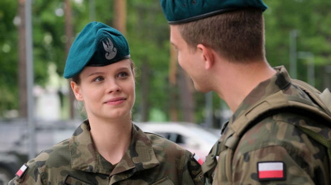 Młoda kobieta w mundurze wojskowym i zielonym berecie z orłem, uśmiecha się patrząc na mężczyznę w wojskowym stroju. Na mundurach widoczne polskie flagi, tło rozmyte. Scena odzwierciedla relacje z "M jak miłość". Więcej o serialach na Super Seriale.