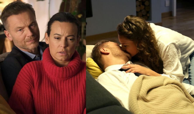 Krystian Wieczorek jako Andrzej Budzyński patrzy z troską na Annę Muchę, czyli Magdę, w tle intymna scena pocałunku Andrzeja z Pauliną (Maria Wieczorek). Ten obraz symbolizuje zdradę w "M jak miłość". Więcej informacji o serialu znajdziesz na Super Seriale.