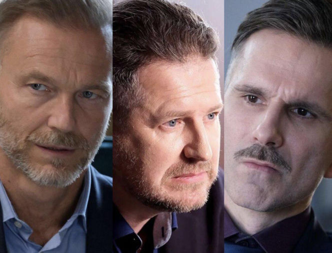 Zestawienie portretów aktorów Krystiana Wieczorka jako Andrzeja Budzyńskiego, Marcina Bosaka jako Kamila Gryca i Marcina Piętowskiego jako Igora Jabłońskiego, patrzących z powagą. Ta grafika, dostępna na stronie Super Seriale, ilustruje nadchodzący konflikt w serialu "M jak miłość".