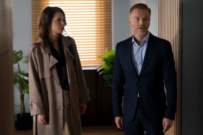 Maria Wieczorek jako Paulina Lipska i Krystian Wieczorek jako Andrzej Budzyński patrzą na siebie z troską. Maria ma na sobie beżowy płaszcz i ciemną bluzkę, a Krystian granatowy garnitur i jasną koszulę. Więcej o ich losach w Super Seriale.