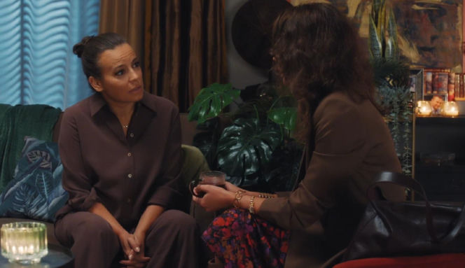 Paulina Lipska i Magda Budzyńska rozmawiają na kanapie w mieszkaniu Budzyńskich. Paulina (po lewej), ubrana na brązowo, patrzy z powagą na Magdę (po prawej), która trzyma kubek. Opowieść Pauliny o mężu wzbudza współczucie Magdy, o czym przeczytasz na Super Seriale.