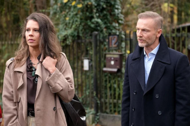 Maria Wieczorek jako Paulina Lipska w beżowym płaszczu i Andrzej Budzyński w granatowym płaszczu i jasnej koszuli stoją na zewnątrz, spoglądając w bok. Paulina, była ukochana Budzyńskiego, wraca, sprowadzając kłopoty z mężem gangsterem. Więcej na ten temat znajdziesz na Super Seriale.