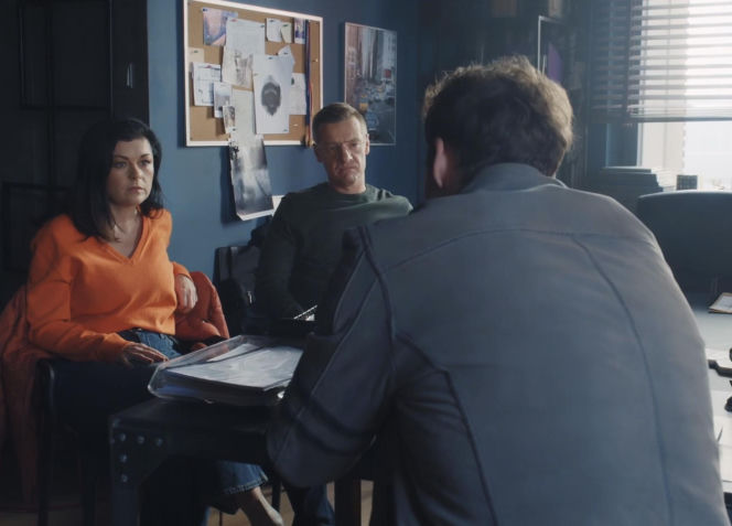 Kinga (Katarzyna Cichopek) i Piotrek (Marcin Mroczek) rozmawiają z Marcinem (Mikołaj Roznerski) w jego biurze detektywistycznym. Kinga w pomarańczowym swetrze, Piotrek w zielonej bluzie, obaj patrzą na Marcina, którego widać od tyłu. Scena z "M jak miłość" w kontekście poszukiwań Pawła. Więcej informacji o serialu znajdziesz na Super Seriale.