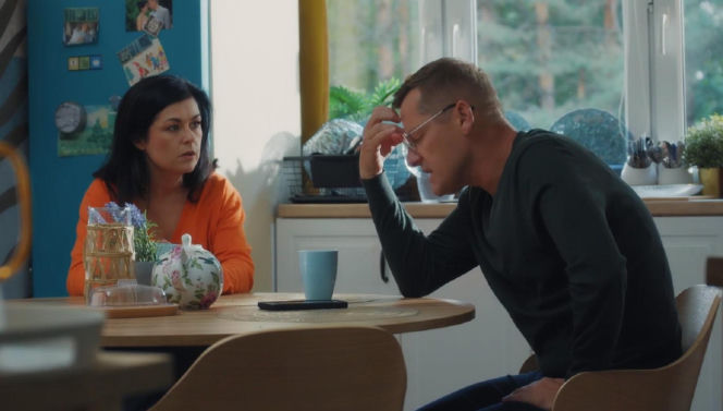 Kinga Zduńska (Katarzyna Cichopek) w pomarańczowym swetrze, z zatroskaną miną, siedzi przy stole naprzeciwko męża, Piotrka Zduńskiego (Marcin Mroczek), który w ciemnej bluzce opiera się o stół, trzymając dłoń na czole, wyraźnie przygnębiony. Zdjęcie ilustruje scenę ze złego stanu psychicznego Piotrka po spotkaniu z Pawłem, o czym można przeczytać na Super Seriale.