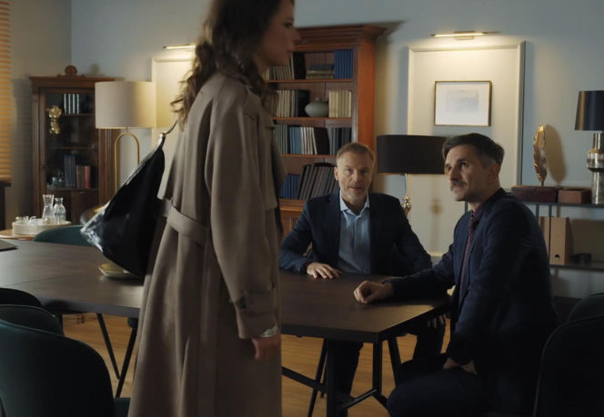 Paulina Lipska w beżowym płaszczu wychodzi z biura, odwracając się plecami do Kamila Gryca i Andrzeja Budzyńskiego, którzy siedzą przy stole. Scena ilustruje konflikt z Igorem Jabłońskim z serialu "M jak miłość". Więcej o losach bohaterów przeczytasz na Super Seriale.