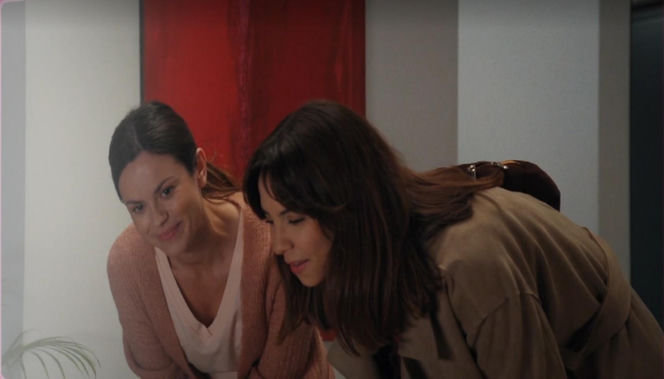 Aneta (Ilona Janyst) z uśmiechem spogląda na śpiącą Zosię, podczas gdy Kasia (Paulina Lasota) pochyla się nad łóżeczkiem, wyglądając na zmartwioną. Scena z serialu "M jak miłość", odcinek 1919, gdzie Aneta odkrywa kłamstwo Kasi. Więcej o wątkach przeczytasz na portalu Super Seriale.
