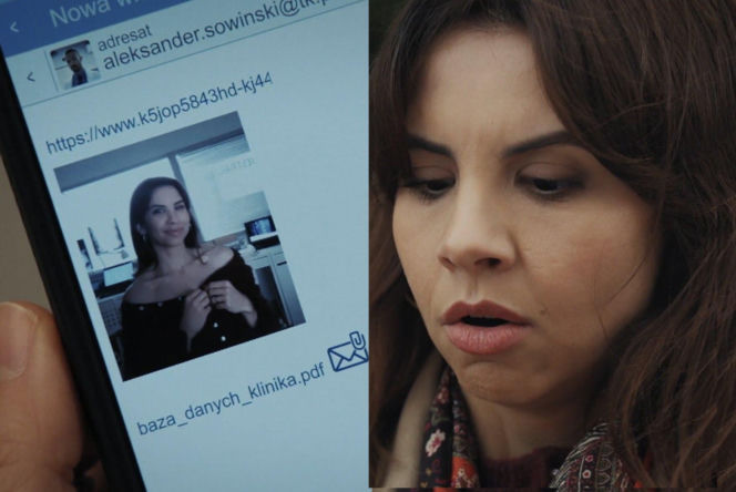 Ilona Janyst jako Aneta Chodakowska z serialu "M jak miłość" z przerażeniem patrzy na telefon, gdzie widać nagranie, które omyłkowo wysłała nowemu szefowi. Kadr z serialu "M jak miłość" przedstawiający pomyłkę Anety. Więcej o tym na Super Seriale.