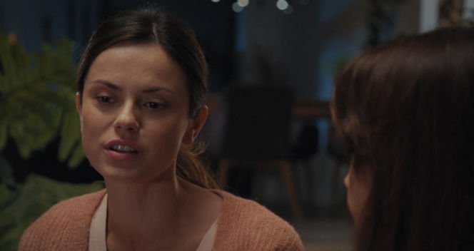 Paulina Lasota jako Kasia z serialu "M jak miłość" rozmawiająca z przyjaciółką Anetą. Kasia, ubrana w beżowy sweter, ma zmartwiony wyraz twarzy. Scena oddaje emocje i wątpliwości Kasi przed ślubem z Mariuszem, co można przeczytać na Super Seriale.