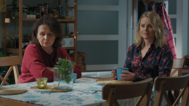 Marysia (Małgorzata Pieńkowska) w czerwonej bluzce i Judyta (Paulina Chruściel) w granatowej koszuli w kwiaty siedzą przy stole w domu Mostowiaków. Judyta trzyma niebieski kubek, a Marysia wydaje się zmęczona. Obie rozmawiają o relacji Joanny i Artura, o czym możesz przeczytać więcej na Super Seriale.