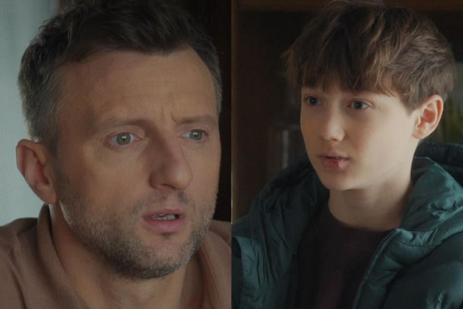 Bliskie ujęcia twarzy Bartka (Arkadiusz Smoleński) i Franka z serialu "M jak miłość". Bartek, mężczyzna w średnim wieku z krótkimi, ciemnymi włosami, ma zamyśloną minę. Franek, chłopiec z rozczochranymi ciemnymi włosami w ciemnozielonej kurtce, ma lekko uchylone usta. Więcej informacji o serialu "M jak miłość" na portalu Super Seriale.
