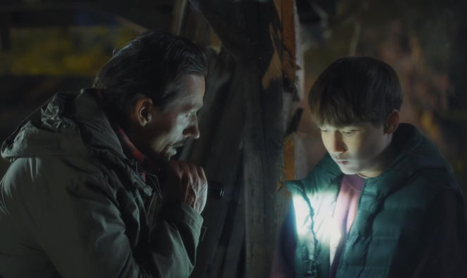 Zastraszony Franek (Jarosław Śmigielski) i bezwzględny ojczym (Marcin Sitek) w scenie z serialu "M jak miłość". Mężczyzna trzyma latarkę, a światło pada na twarz chłopca. Więcej o dramacie Franka przeczytasz na portalu Super Seriale.