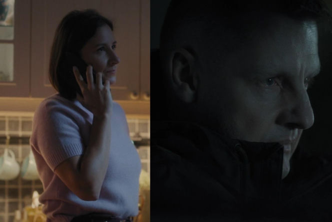 Kolaż z Agnes (Amanda Mincewicz) rozmawiającą przez telefon w jasnym swetrze i Pawłem (Rafał Mroczek) w ciemnym wnętrzu, słuchającym wiadomości. Zdjęcie ilustruje scenę, w której Agnes próbuje przekonać Pawła do powrotu do Grabiny, co można przeczytać na Super Seriale.
