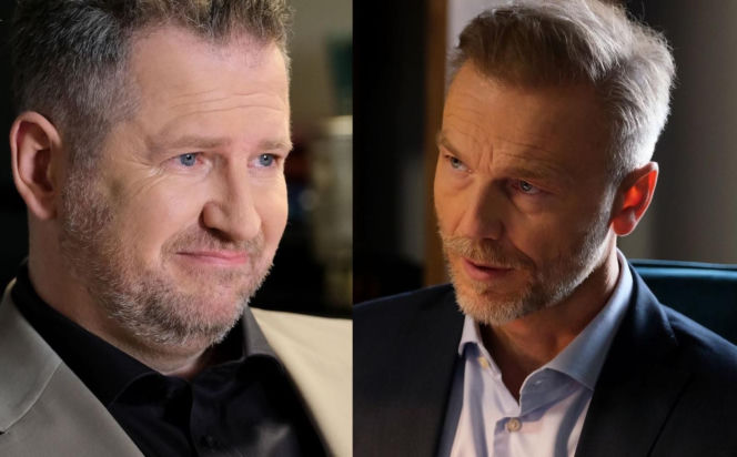 Zbliżenia na twarze Marcina Piętowskiego jako Jabłońskiego i Krystiana Wieczorka jako Budzyńskiego, z tłem sugerującym wnętrza. Jabłoński grozi Budzyńskiemu, mężowi Pauliny, biorąc na celownik Magdę, co widać w najnowszych odcinkach, dostępnych na Super Seriale.