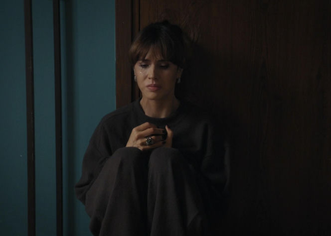 Kobieta Kama (Michalina Sosna) siedzi na podłodze, oparta o ścianę, w ciemnym swetrze i spodniach, ze łzami spływającymi po policzku, ma dłonie splecione na piersi, pierścionek z dużym oczkiem na palcu, a jej twarz wyraża smutek i rozpacz. Scena z serialu "M jak miłość", o którym przeczytasz więcej na Super Seriale.
