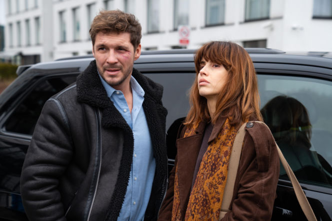 Michalina Sosna jako Kama i Mikołaj Roznerski jako Marcin z podbitym okiem, stojący obok czarnego samochodu, na tle jasnego budynku. Wyraz twarzy Kamy jest zamyślony, podczas gdy Marcin patrzy w bok. Ich małżeństwo z serialu "M jak miłość" ma się zakończyć, o czym przeczytasz na portalu Super Seriale.