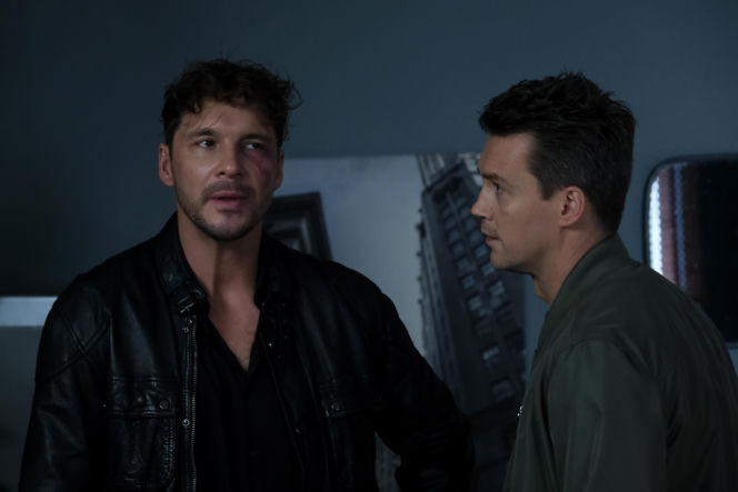 Marcin Chodakowski (Mikołaj Roznerski) z podbitym okiem, w czarnej skórzanej kurtce, stojący obok innego mężczyzny, rozmawiający po bójce, co wskazuje na jego trudny okres po rozstaniu z Kamą. Więcej o losach bohatera serialu "M jak miłość" znajdziesz na Super Seriale.
