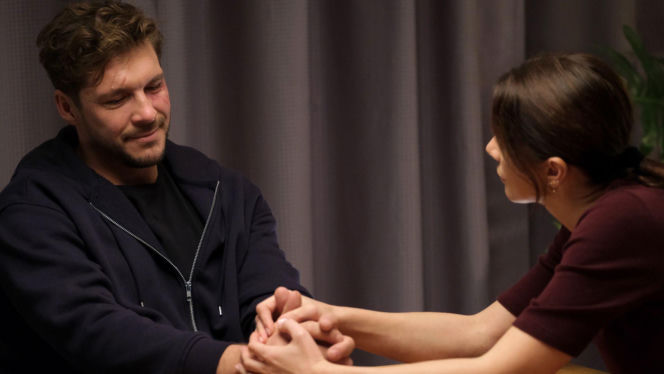 Mężczyzna z zarostem, w ciemnej bluzie z rozpiętym zamkiem, ze śladami na twarzy, trzyma dłonie kobiety, której widać jedynie prawy profil i prawe ramię, w bordowej koszulce. Para patrzy na siebie, wyrażając intymność, co dotyczy serialu "M jak miłość" na Super Seriale.