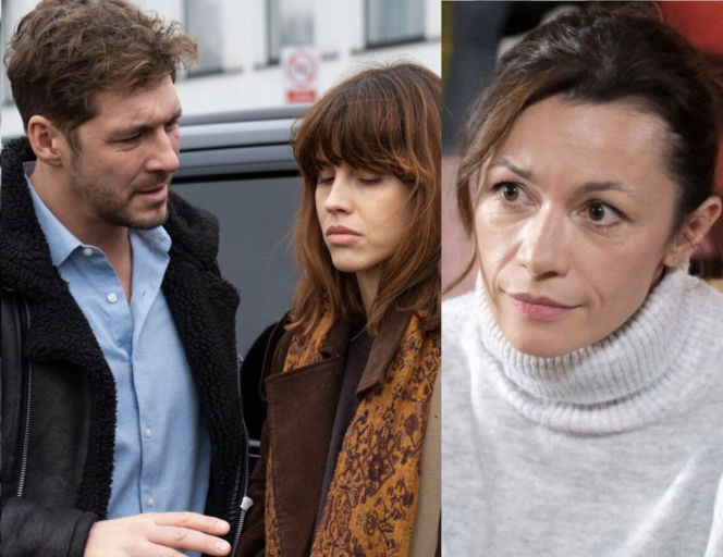 Martyna (Magdalena Turczeniewicz) w białym golfie zamyślona, obok Marcin (Mikołaj Roznerski) z podbitym okiem w czarnej kurtce z barankiem i błękitnej koszuli, obok niego Kama (Michalina Sosna) w brązowym płaszczu i wzorzystym szalu, ze spuszczoną głową. Zdjęcie ilustruje odcinek "M jak miłość" dostępny na Super Seriale.