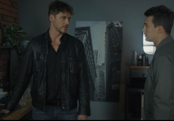 Jakub Kwiatkowski i Mikołaj Roznerski w scenie z serialu "M jak miłość". Jakub, ubrany w czarną skórzaną kurtkę i koszulę, patrzy na Marcina, który odwrócony stoi obok niego. Obaj aktorzy odgrywają emocjonalną scenę, o której przeczytasz więcej na portalu Super Seriale.