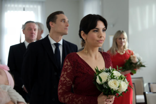 Aneta (Ilona Janyst) w bordowej koronkowej sukience, z bukietem białych róż, obserwuje ceremonię ślubną Kasi i Mariusza w M jak miłość. Obok niej stoi pan młody Mariusz (Mateusz Mosiewicz) w garniturze. O tym, jak Aneta uratuje ten ślub, przeczytasz na stronie Super Seriale.