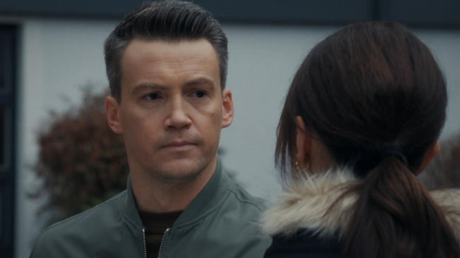 Krzysztof Kwiatkowski jako Jakub Karski w kurtce bomberce, patrzący z powagą na niewidoczną kobietę z brązowym kucykiem, w tle niewyraźny budynek i krzewy. Konflikt między Jakubem a Martyną w "M jak miłość" na portalu Super Seriale.